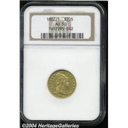 <B>1802/1<$2 1/2> AU50 NGC.</B></I> Type of Bass-3007, R.4. Despite a stingy mintage of 3,035 pieces, three die marriages are known for the 1802, all of which share a common obverse. The present reverse marriage is noted for a bold die line from the upper left shield corner. The remaining luster is substantial and there are no obtrusive abrasions. Struck from lightly clashed dies. While all 1802 Quarter Eagles are traditionally referred to as overdates, no examples are known that display an irrefutable underdigit, and many numismatists regard the final digit as merely repunched. <BR><BR><B>Important notice:</B> Heritage usually auctions material at the rate of 200-250 lots per hour. On some occasions eBay Live bid software or the Internet may not be able to keep up with the pace of the auction. We recommend placing a realistic absentee bid now as insurance to avoid disappointment. Occasionally the auctioneer may eliminate or reject an eBay Live bid, and the auctioneer may also reopen a lot after the close of the eBay live bidding (usually because we missed an audience bid), and may reject your bid even if it shows you as the winning bidder. By bidding via eBay Live, you agree that Heritage may award the lot to another bidder at its sole discretion under the circumstances described above or any other reasonable circumstances. Since eBay bids are not shown to us until we open the lot on the floor, we treat those bids just like floor bids. In most cases the floor responds before the eBay bid is presented to us, due to Internet lag time, so for consistency we have made it a policy that floor bids are always considered first over tie eBay live bids. Also please note that all Heritage lots purchased through eBay Live carry a 20% Buyer's Premium. Please make sure you read the Terms and Conditions before you bid.