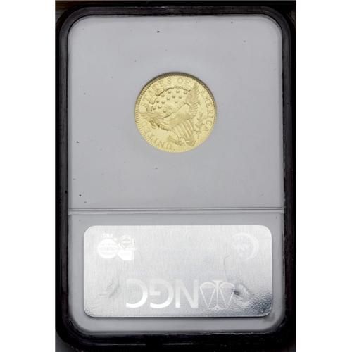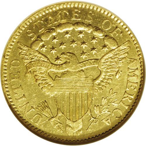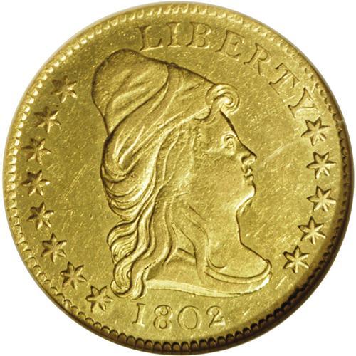 <B>1802/1<$2 1/2> AU58 NGC.</B></I> Breen-6118, Bass-3008, R.6. The rarest of three die marriages for the year. The ES in STATES is widely spaced, and the upright of the E is centered between a pair of clouds. The eagle's lower beak is extended due to a minor engraving blunder. Ample satin luster emerges when this pale-gold example is rotated beneath a light. The centers show some softness of strike, as usual for this early gold type. Light friction on the obverse highpoints prevents a Mint State grade. A small planchet flaw (as made) beneath the chin will identify the present piece. While all 1802 Quarter Eagles are traditionally referred to as overdates, no examples are known that display an irrefutable underdigit, and many numismatists regard the final digit as merely repunched. Despite a stingy mintage of 3,035 pieces, three die marriages are known for the 1802, all of which share a common obverse.