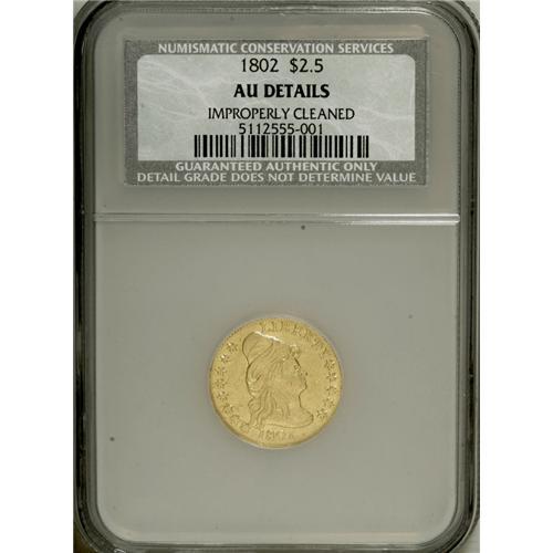 <B>1802/1 $2 1/2 --Improperly Cleaned--NCS. AU Details.</B></I> Breen-6118, BD-1, R.4. Luster connects the stars and legends, and fills the crevices of the devices. This piece is moderately hairlined and has numerous tiny abrasions on the portrait. The reverse is nearly unmarked. The eagle's neck is soft, but the remainder of the design is well defined.<BR><BR><b>Shipping:</b> Coins & Currency (<a target="_blank" href="http://www.heritageauctions.com/common/shipping.php">view shipping information</a>)