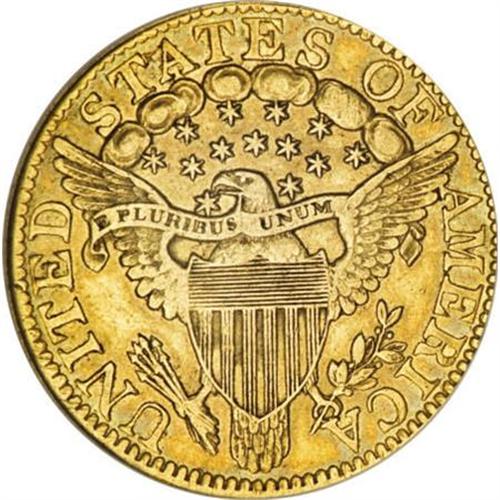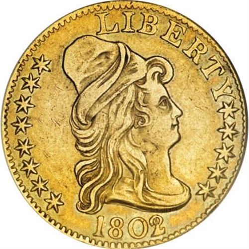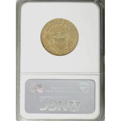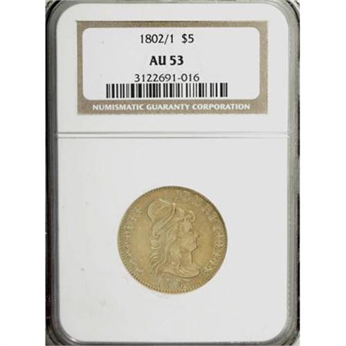 <B>1802/1 $5 AU53 NGC.</B></I> Breen-6440, BD-2, High R.4. BD Die State a/b. Of the eight die marriages known for 1802 half eagles, all are overdates. This variety is quickly identifiable by the missing ribbon loop at the eagle's beak. A review of auction records indicates that BD-1 and BD-8 are the more common of the eight varieties, with BD-2 in the middle in terms of availability. The coin displays lovely antique-gold coloration and is refreshingly original. The only surface flaws are a series of nearly circular depressions on Liberty's neck directly below the ear. We are uncertain if these are of mint origin or are post-striking defects.<BR><BR><B>Coin Engraver:</B> Robert Scot<BR><BR><b>Shipping:</b> Coins & Currency (<a target="_blank" href="http://www.heritageauctions.com/common/shipping.php">view shipping information</a>)
