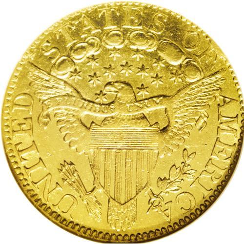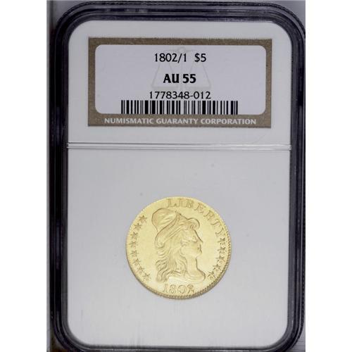 <B>1802/1<$5> AU55 NGC.</B></I> B. 1-D, Breen-6440, Miller-47, Bass-3073, R.4. Two different obverse dies are known for the half eagle coinage of 1802, and both are 1802/1 overdates. Breen's obverse 1 has the final digit low and well separated from the bust, while his obverse 2 has the digit high and (virtually) joined to the bust. The small die chip above the left wingtip and the incomplete ribbon loop in the eagle's beak immediately confirm the reverse of this variety. This die combination is easily the single most common variety of the date. A few minor surface marks and light scratches can be seen on each side. This example has light greenish-gold surfaces with considerable satiny luster.