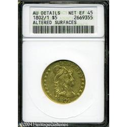 1802/1 $5 --Altered Surfaces--ANACS. AU Details, Net <B>1802/1 $5 --Altered Surfaces--ANACS. AU Details, Net XF45.</B></I> Breen-6440, B. 1-C, Miller-46, R.5. The 1802 half eagle is undoubtedly one of the most obvious overdates in U.S. numismatics. There are two variants of this overdate and on this die variety the 1 is centered in the middle of the 2. Well detailed for the grade, there are a few tiny planchet flakes and minor abrasions on the reverse, but the main objection on this coin is the "pickled" appearance on the obverse, thus the "altered surfaces" disclaimer by ANACS. <BR><BR><B>Important notice:</B> Heritage usually auctions material at the rate of 200-250 lots per hour. On some occasions eBay Live bid software or the Internet may not be able to keep up with the pace of the auction. We recommend placing a realistic absentee bid now as insurance to avoid disappointment. Occasionally the auctioneer may eliminate or reject an eBay Live bid, and the auctioneer may also reopen a lot after the close of the eBay live bidding (usually because we missed an audience bid), and may reject your bid even if it shows you as the winning bidder. By bidding via eBay Live, you agree that Heritage may award the lot to another bidder at its sole discretion under the circumstances described above or any other reasonable circumstances. Since eBay bids are not shown to us until we open the lot on the floor, we treat those bids just like floor bids. In most cases the floor responds before the eBay bid is presented to us, due to Internet lag time, so for consistency we have made it a policy that floor bids are always considered first over tie eBay live bids. Also please note that all Heritage lots purchased through eBay Live carry a 20% Buyer's Premium. Please make sure you read the Terms and Conditions before you bid. This lot is being auctioned in conjunction with a live floor auction by Heritage Galleries & Auctioneers. All final auction and invoice information will be supplied by Heritage Galleries & Auctioneers, and all other information should be considered preliminary. Lot:6625