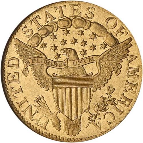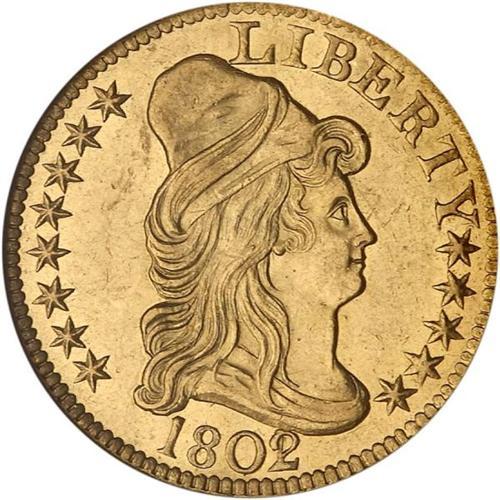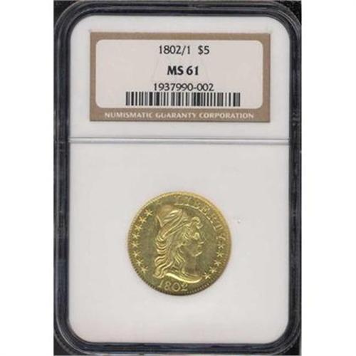 <b>1802/1 $5 Capped Bust. NGC graded MS61.</b> Lustrous light greenish gold with very pleasing surfaces. A few minor marks here and there, but excellent detail in the centers. The dies struck this one with the requisite force, enough so to bring up the stars, curls and feathers on both sides.