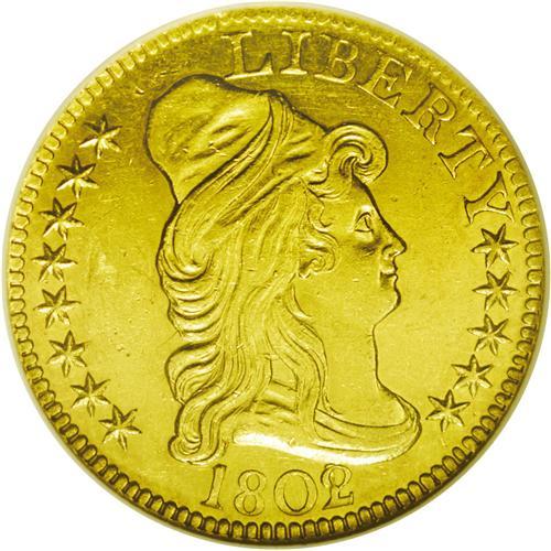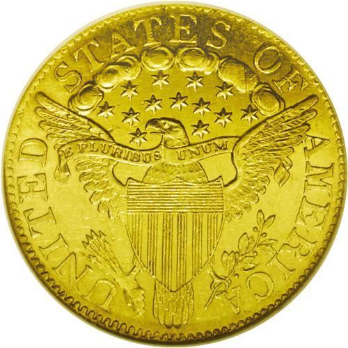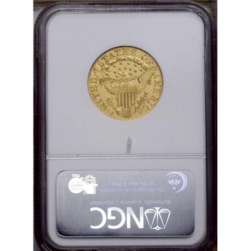 <B>1802/1<$5> MS61 NGC.</B></I> Breen-6440, B. 2-H and I, Miller-54, R.4. According to Q. David Bowers' <I>The Harry W. Bass, Jr. Museum Sylloge,</B></I> there are eight known die varieties for 1802 half eagles, all of which have the final 2 in the date punched over a 1. The issue was struck with two obverse dies, which are distinguished by different centering of the underdigit 1. The Breen-2 obverse is also noted for a recut lower right foot on the E in LIBERTY. This needle-sharp and moderately prooflike example has no individually mentionable abrasions. A pronounced green-golden finish is presented over each side and just a few scattered hairlines in the fields serve to limit the grade. Census: 41 in 61, 48 finer (5/06).