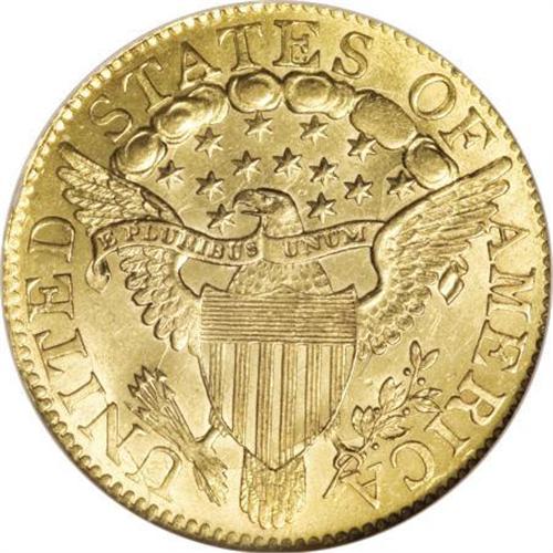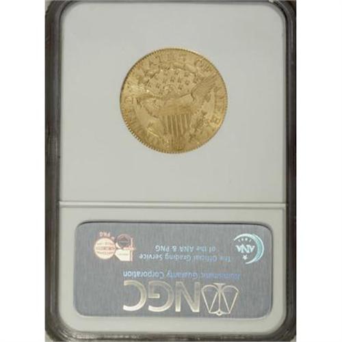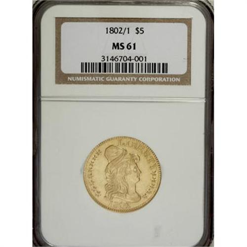 <B>1802/1 $5 MS61 NGC.</B></I> Breen-6440, BD-8, R.4. This issue is always popular with collectors due to the fact that each of the eight known 1802 half eagle varieties are bold overdates and it is one of the more available dates in the Capped Bust Right, Heraldic Eagle five dollar series. The 1802/1 is not exactly common, however. The 2006 Bass-Dannreuther reference entitled <I>Early U.S. Gold Coin Varieties</B></I> opines that only 400 to 500 examples are extant in all grades. This is one of the few Uncirculated pieces known. The surfaces are bright and show good mint luster, especially on the reverse. Sharply struck throughout on both the hair curls of Liberty and the eagle's plumage above the shield. Only the slightest abrasions can be seen with a magnifier, none of which are large enough for individual mention.<BR><BR><B>Coin Engraver:</B> Robert Scot<BR><BR><b>Shipping:</b> Coins & Currency (<a target="_blank" href="http://www.heritageauctions.com/common/shipping.php">view shipping information</a>)