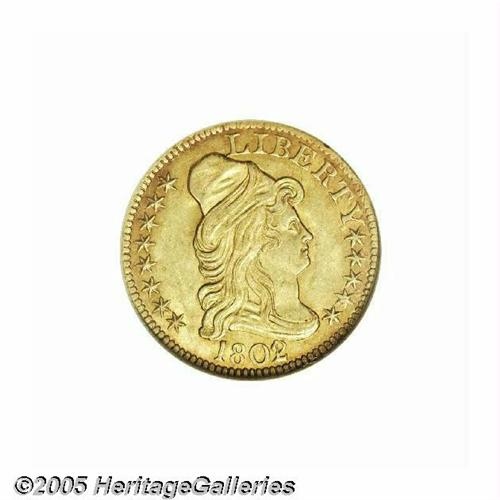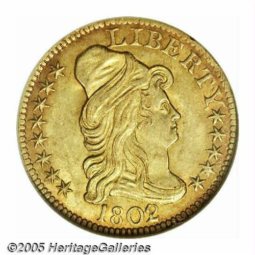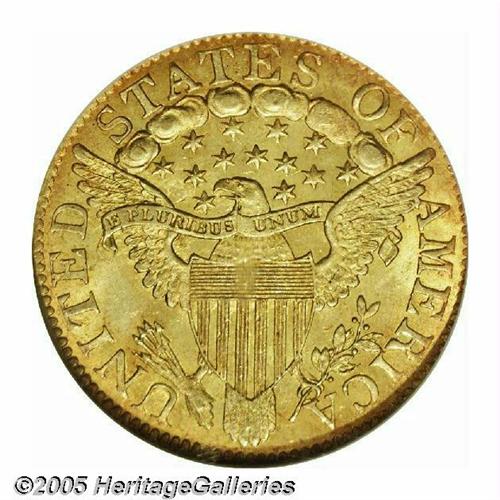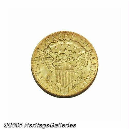 <B>1802/1<$5> MS64 NGC.</B></I> B. 2-H and I, Miller-54, R.4. The 1802/1, along with the 1800, is the most frequently encountered Capped Bust half eagle in grades up to and including MS63. At the MS64 level it is a significant condition rarity with only a couple of dozen pieces (at most) known, and it is virtually unobtainable as a Gem. This variety is identifiable by the long spine on the reverse that runs from a leaf into the R in AMERICA. Struck from an intermediate-late die state as evidenced by the lack of die clashing, the regrinding and strengthening of the reverse die, and one (but not two) die cracks through (UNIT)ED on the reverse. As such, this piece is from the same die state as the MS63 coin we offered in our 2003 FUN Sale. This is an especially pleasing coin that shows crisp striking definition in virtually all areas, most notably on the hair curls of Liberty and the eagle's breast feathers. The bright, lustrous surfaces are accented by rich reddish patina around the margins with the usual green-gold coloration elsewhere. Population: 14 in 64, 1 finer (6/05).<BR><I>From The Melrose Bay Collection.</B></I>