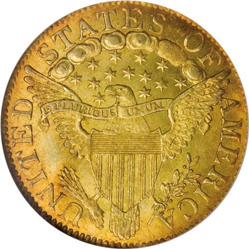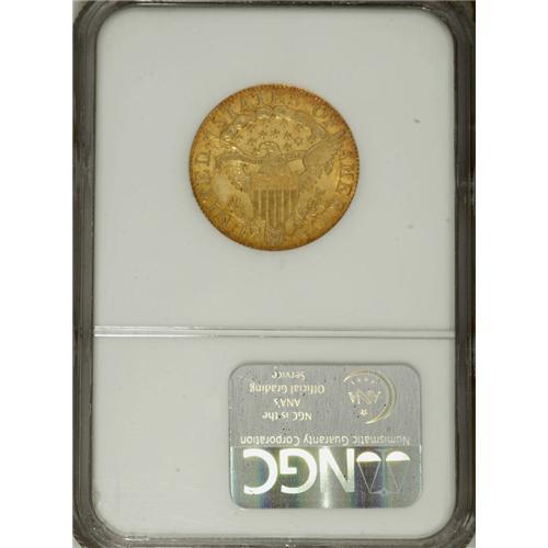 <B>1802/1 $5 MS64 NGC.</B></I> Breen-6440, BD-8, R.4. The 1802/1 is frequently encountered in grades up to and including MS63. At the MS64 level it is a significant condition rarity with only a couple of dozen pieces (at most) known, and it is virtually unobtainable as a Gem. The Harry Bass Collection, for instance, had eight different examples of this variety with just one coin similarly graded as MS64. This is an especially pleasing coin that shows crisp striking definition in virtually all areas, most notably on the hair curls of Liberty and the eagle's breast feathers. The bright, lustrous surfaces are accented by rich reddish patina around the margins with the usual green-gold coloration elsewhere.<BR> Eight die varieties are known for the 1802/1 half eagles, from two distinctly different obverse dies, both overdated with a 2 punched over a previous 1. Obverse 1 can be identified by the low overdate with the top of the 2 distant from the bust and the previous 1 below the center of the 2. Obverse 2 (and represented here) is identified by a high digit 2 with its top touching the bust, and the previous 1 left of center below the 2. This variety is identifiable by the long spine on the reverse that runs from a leaf into the R in AMERICA. Struck from an intermediate die state with light clash marks on the obverse and a faint die crack from the left top of U through the center of N to the bases of I and T. Census: 15 in 64, 1 finer (3/07).<BR><BR><b>Shipping:</b> Coins & Currency (<a target="_blank" href="http://www.heritageauctions.com/common/shipping.php">view shipping information</a>)