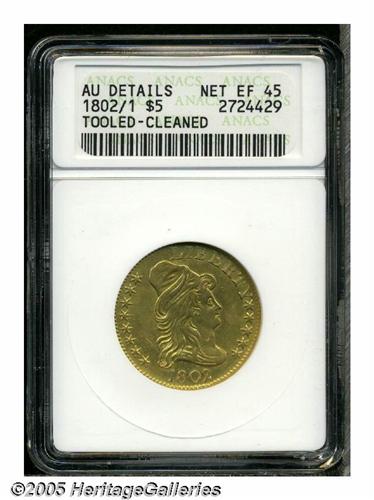 <B>1802/1<$5>--Tooled, Cleaned--ANACS. AU Details, Net XF45.</B></I> Breen-6440, B. 1-C, Miller-46, R.5. The numerous die varieties of 1802/1 Half Eagles long tormented researchers, who for decades were unable to secure satisfactory photographs of the different rare marriages. Both Breen and Miller confused, merged, and missed several varieties. Breen 1-C is the centered overdate and has a prominent die line southeast of the F in OF. Cloudy from a thorough cleaning, this piece displays faint tooling in the field near 3 o'clock. Reasonably struck, noticeable luster accompanies protected areas.<BR><I>From the Dr. Kurt Peters Collection.</B></I> From the Dr. Kurt Peters Collection.