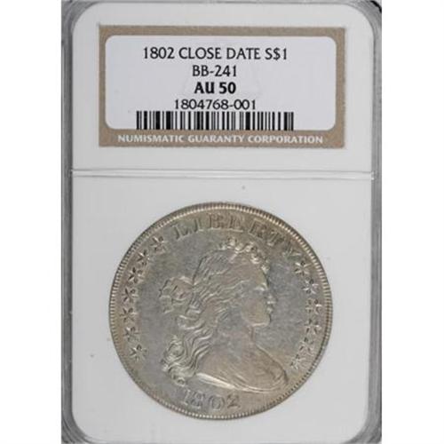 <B>1802 $1 Narrow Date AU50 NGC.</B></I> B-6, BB-241, R.1. B-6 receives a separate <I>Guide Book</B></I> listing as the sole "Narrow Normal Date" variety. Almond-gold and sky-gray tones emerge from this lightly toned and subdued early dollar. Plentiful pockets of luster fill design crevices, and no abrasions are worthy of individual mention. Adjustment marks are faint and localized to 4:30 on the obverse.<I><BR>From The Beau Clerc Collection.</B></I><BR><BR><B>Coin Engraver:</B> Robert Scot<BR><BR><b>Shipping:</b> Coins & Currency (<a target="_blank" href="http://www.heritageauctions.com/common/shipping.php">view shipping information</a>)