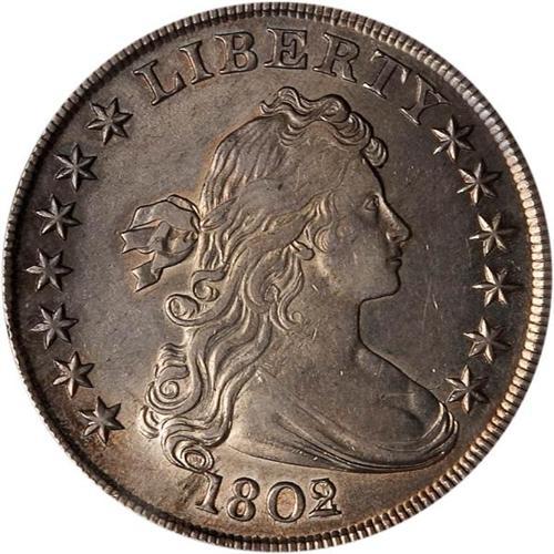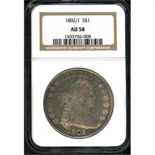 <b>1802/1 Draped Bust Dollar. Narrow date. BB-232. NGC graded AU58.</b> Still lustrous golden gray which has grand overall eye appeal plus the advantage of the 2/1 overdate. The above-average strike complements this eye-appeal and, some might say, adds greatly to the appearance <b>(PCGS # 6898)</b>