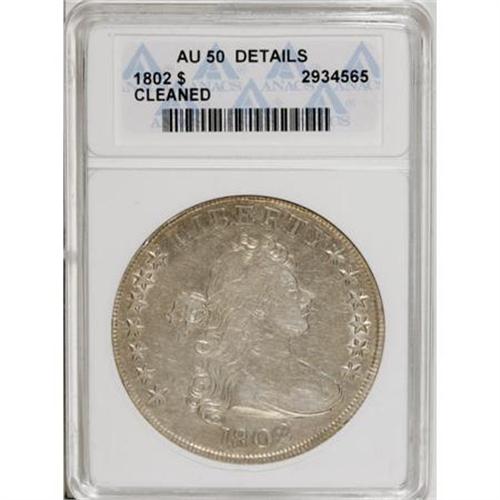<B>1802 $1 Narrow Date--Cleaned--ANACS. AU50 Details.</B></I> B-6, BB-241, R.1. Immediately attributable by the missing right serif on the T in LIBERTY. A bit too bright from the noted cleaning, yet still an attractive coin with a degree of luster visible in the recesses. The expected light wear is visible on the highest points, and there are no notable areas of strike weakness.<BR><BR><B>Coin Engraver:</B> Robert Scot<BR><BR><b>Shipping:</b> Coins & Currency (<a target="_blank" href="http://www.heritageauctions.com/common/shipping.php">view shipping information</a>)