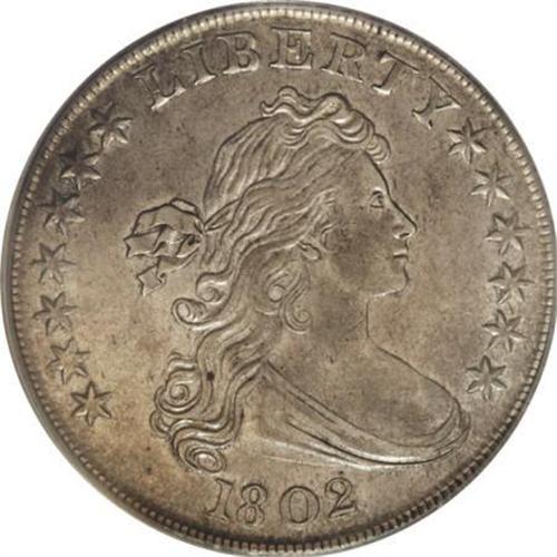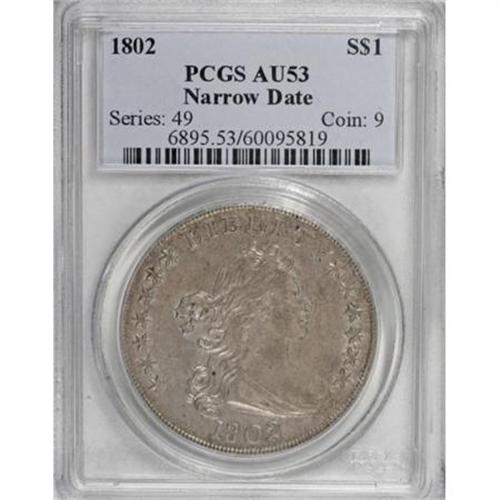 <B>1802 $1 Narrow Date AU53 PCGS.</B></I> B-6, BB-241, R.1. A still-lustrous example that is solidly struck with predominately light steel-gray color and delicate yellow-gold accents. Scarcely visible is an ancient pinscratch that connects star 7 to the E in LIBERTY. On the reverse, a curious, triangular-shaped stain stays within the boundaries of the eagle's scroll and shield.<BR><BR><B>Coin Engraver:</B> Robert Scot<BR><BR><b>Shipping:</b> Coins & Currency (<a target="_blank" href="http://www.heritageauctions.com/common/shipping.php">view shipping information</a>)