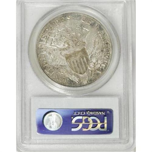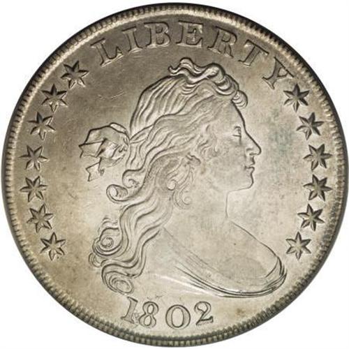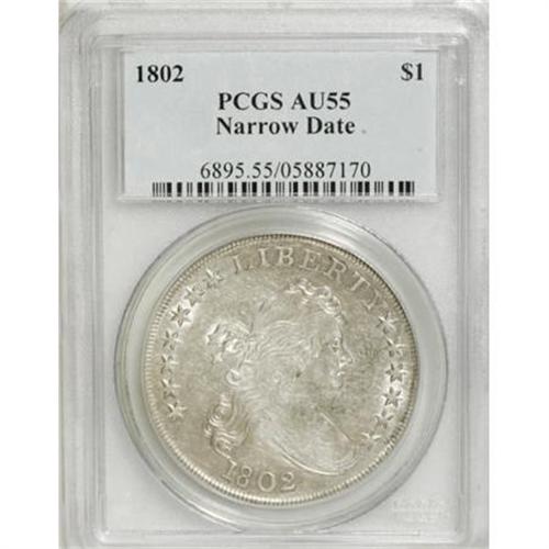 <B>1802 $1 Narrow Date AU55 PCGS.</B></I> B-6, BB-241, R.1. The 1802 B-6 silver dollar ranks among the most common Draped Bust silver dollar varieties of any date. It makes a perfect representative of the Draped Bust/Heraldic Eagle design type for a type collector. Date specialists will also need to acquire an example of the overdate. <BR> This wonderful dollar is highly lustrous with only a trace of rub on the central obverse and reverse motifs. Both sides are essentially brilliant with only a trace of faint gold and steel toning. Both dies are perfect without any evidence of clashmarks, die cracks, or lapping. Population: 1 in 55, 5 finer (12/07).<BR><BR><B>Coin Engraver:</B> Robert Scot<BR><BR><b>Shipping:</b> Coins & Currency (<a target="_blank" href="http://www.heritageauctions.com/common/shipping.php">view shipping information</a>)