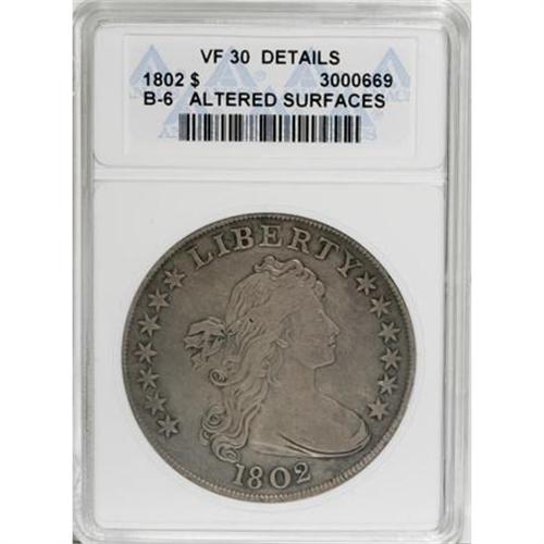 <B>1802 $1 Narrow Date--Altered Surfaces--ANACS. VF30 Details.</B></I> B-6, BB-241, R.1. Medium lilac-brown toning is consistent across this finely granular early dollar. Light adjustment marks are limited to OF and nearby clouds. Sharp for the VF level.<BR><BR><B>Coin Engraver:</B> Robert Scot<BR><BR><b>Shipping:</b> Coins & Currency (<a target="_blank" href="http://www.heritageauctions.com/common/shipping.php">view shipping information</a>)