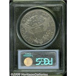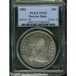 <B>1802<img border='0' src='http://www.heritagecoins.com/images/star.gif' width=10 height=10>$1 Narrow Date VF35 PCGS.</B></I> B-6, BB-241, R.1. B-6 is most easily distinguished from B-5 by the absent right foot of the T in LIBERTY. This piece is relatively well defined for the grade, and the surfaces are lightly abraded, and each side shows medium, uniform gray toning with localized areas of slightly darker color on the obverse.