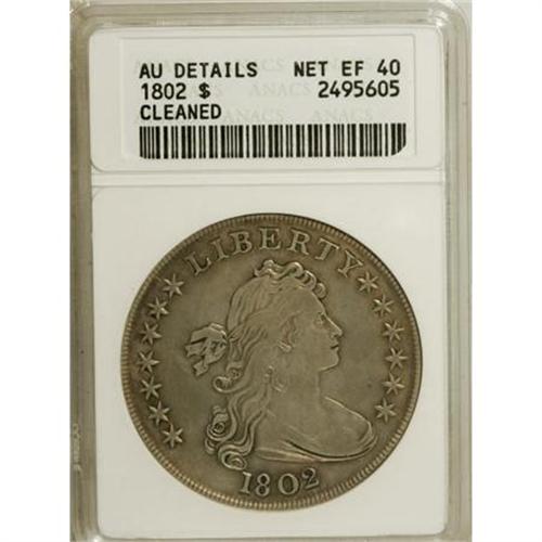 <B>1802 $1 Narrow Date--Cleaned--ANACS. AU Details. Net XF40.</B></I> B-6, BB-241, R.1. Bowers-Borckardt Die State III. Dusky caramel-gold and pearl-gray toning embraces this splendidly detailed Draped Bust dollar. Faint hairlines are detected beneath a loupe, but the eye appeal is undeniable, since the surfaces have far fewer than the usual number of marks.<BR><BR><B>Coin Engraver:</B> Robert Scot<BR><BR><b>Shipping:</b> Coins & Currency (<a target="_blank" href="http://www.heritageauctions.com/common/shipping.php">view shipping information</a>)