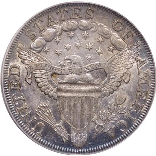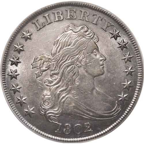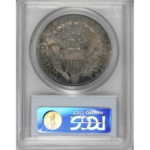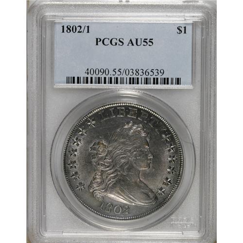 <B>1802/1 S$1 Narrow Date AU55 PCGS.</B></I> B-4, BB-232, R.4. This is an impressive Choice AU piece with nearly full luster beneath steel-gray surfaces with hints of lighter gold on the reverse. A few tiny splashes of russet toning are evident on parts of the devices, mostly on the obverse. The overall aesthetic appeal is exceptional. An intermediate die state, the obverse has a fine crack or defect line from star 13 across the drapery. There is faint evidence of a second obverse crack from star 7 through L, although that area is obscured by flowlines. The reverse has a short crack from the second feather to the border at 10 o'clock. Population: 1 in 55, 0 finer (3/07).<BR><BR><b>Shipping:</b> Coins & Currency (<a target="_blank" href="http://www.heritageauctions.com/common/shipping.php">view shipping information</a>)