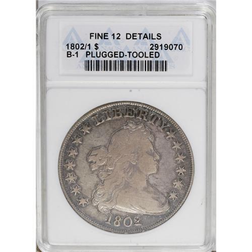 <B>1802/1 S$1 Narrow Date--Plugged, Tooled--ANACS. Fine 12 Details.</B></I> B-1, BB-231, R.4. A small hole between the E and R of LIBERTY has been plugged and the surrounding field tooled. Heavily worn with reddish-gold and dark blue patina on each side.<BR><BR><b>Shipping:</b> Coin/Currency (<a target="_blank" href="http://www.heritageauctions.com/common/shipping.php">view shipping information</a>)