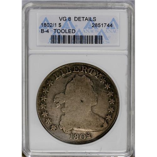 <B>1802/1<img border='0' src='http://www.heritagecoins.com/images/star.gif' width=10 height=10>$1> Narrow Date--Tooled--ANACS. VG8 Details.</B></I> B-4, BB-232, R.3. Harshly cleaned, and the letter I has been pinscratched near the tail, but no evidence of smoothing or strengthening is detected. About two-thirds of E PLURIBUS UNUM is present.
