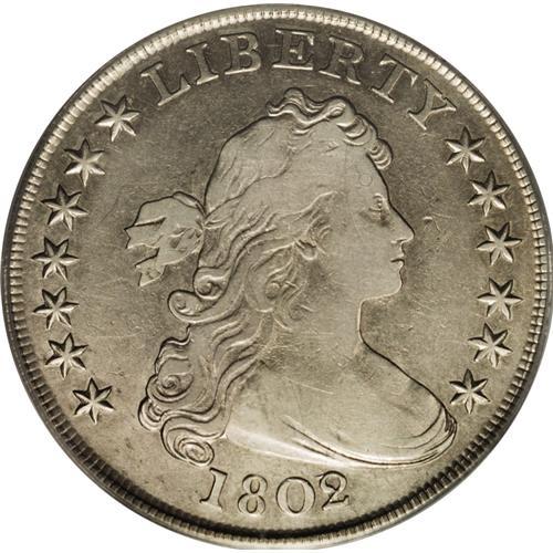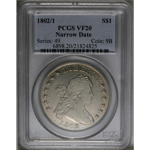 <B>1802/1 S$1 Narrow Date VF20 PCGS.</B></I> B-2, BB-233, R.4. Die State I. Wide overdate, 18 widely spaced, 80 closer, 02 closest; projection at lower right curve of D. Apparently always with perfect dies in this die marriage. The reverse die was used for seven different varieties dated 1801, 1802, and 1803. Thus we have two reverse dies that were "workhorse" dies, used for 13 different varieties out of 16 total for the three dates. Recognition of these two reverse dies is the first step in an attribution scheme for the various varieties coined in these three years.<BR> The absence of a die crack from the border right of the final S (see 1801 B-4) tells us that this variety was struck before the 1801 B-4 silver dollar. Both sides have pleasing grayish-gold color with light gray on the devices. Certainly cleaned long ago, but beginning to reacquire an attractive and natural patina. The usual scattered marks are present, with a thin scratch down from Liberty's top curls to the cheek.<BR><I>Ex: I. Kleinman (2/2002).</B></I><BR><I>From The William Luebke Collection.</B></I><BR><BR><b>Shipping:</b> Coin/Currency (<a target="_blank" href="http://www.heritageauctions.com/common/shipping.php">view shipping information</a>)