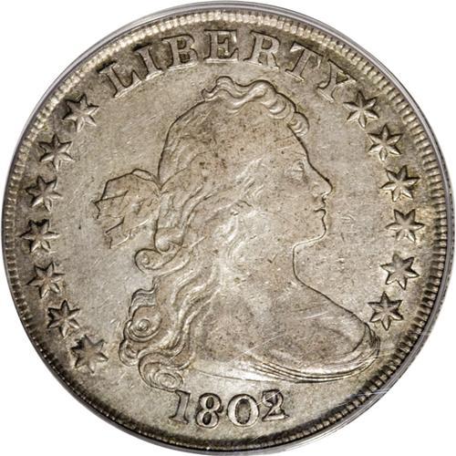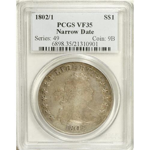<B>1802/1 S$1 Narrow Date VF35 PCGS.</B></I> B-4, BB-232, R.3. A charming pearl-gray and lilac Draped Bust dollar that has unmarked surfaces and an original appearance. The reverse is surprisingly sharp for the VF35 grade, although wear is present on Liberty's forehead, cheek, and bust truncation. A collectible but problem-free example of this popular variety.<BR><BR><b>Shipping:</b> Coin/Currency (<a target="_blank" href="http://www.heritageauctions.com/common/shipping.php">view shipping information</a>)