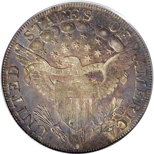 <B>1802/1 S$1 Wide Date AU53 PCGS.</B></I> B-3, BB-234, R.3. A pleasing example of this overdate variety with considerable luster. The obverse is mostly toned with considerable steel, rose, and pale gold color. A patch of light ivory color is visible at the upper left obverse. The reverse is similarly and completely toned. A small raised die flaw is visible in the upper right obverse field, quickly identifying this variety.<BR><BR><b>Shipping:</b> Coins & Currency (<a target="_blank" href="http://www.heritageauctions.com/common/shipping.php">view shipping information</a>)