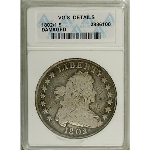 <B>1802/1 S$1 Wide Date--Damaged--ANACS. VG8 Details.</B></I> B-3, BB-234, R.3. A heavily worn dove-gray and slate-gray example of this scarce overdate variety. Numerous heavy abrasions affect the devices and nearby fields on each side.<BR><BR><b>Shipping:</b> Coin/Currency (<a target="_blank" href="http://www.heritageauctions.com/common/shipping.php">view shipping information</a>)
