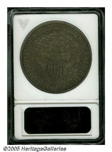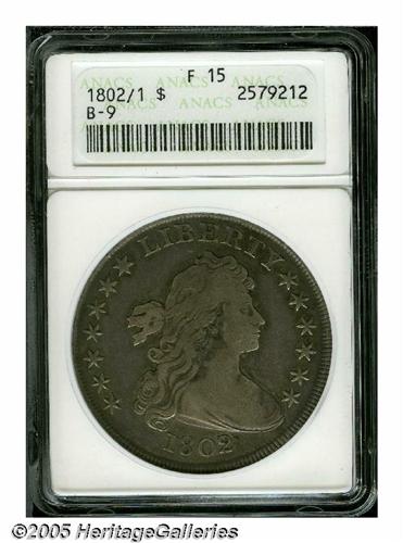 <B>1802/1<S$1> Wide Date Fine 15 ANACS.</B></I> B-9, BB-235, R.4. Lovely medium to dark gray in color which is evenly distributed over the surfaces, with slightly darker tones near the devices. A fairly early die state with the die crack just starting below Liberty's breast, and after a few more coins were struck this crack expands upward through the stars retiring this obverse die. The surfaces are attractive for the grade, and this coin has no major detractions. For the numismatist, this scarce variety represents good value and scarcity for the moderate grade.