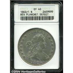 <B>1802/1<S$1> Wide Date--Reverse Planchet Defect--XF40 ANACS.</B></I> B-3, BB-234, High R.2. Die State III, which features a mint-made die lump between the forehead and star 8. A small "spur" on the D in UNITED attributes the reverse. As is noted on the ANACS holder, a diagonal planchet striation is seen from the eagle's wing to the R of AMERICA on the reverse. The surfaces are a light silver-gray color with steel-gray accents on selected highpoints. The underdigit is clear, this being one of the most prominent of all overdate issues. <BR><BR><B>Important notice:</B> Heritage usually auctions material at the rate of 200-250 lots per hour. On some occasions eBay Live bid software or the Internet may not be able to keep up with the pace of the auction. We recommend placing a realistic absentee bid now as insurance to avoid disappointment. Occasionally the auctioneer may eliminate or reject an eBay Live bid, and the auctioneer may also reopen a lot after the close of the eBay live bidding (usually because we missed an audience bid), and may reject your bid even if it shows you as the winning bidder. By bidding via eBay Live, you agree that Heritage may award the lot to another bidder at its sole discretion under the circumstances described above or any other reasonable circumstances. Since eBay bids are not shown to us until we open the lot on the floor, we treat those bids just like floor bids. In most cases the floor responds before the eBay bid is presented to us, due to Internet lag time, so for consistency we have made it a policy that floor bids are always considered first over tie eBay live bids. Also please note that all Heritage lots purchased through eBay Live carry a 20% Buyer's Premium. Please make sure you read the Terms and Conditions before you bid. </span></font></tr></table></td></tr></table>
