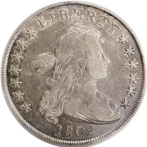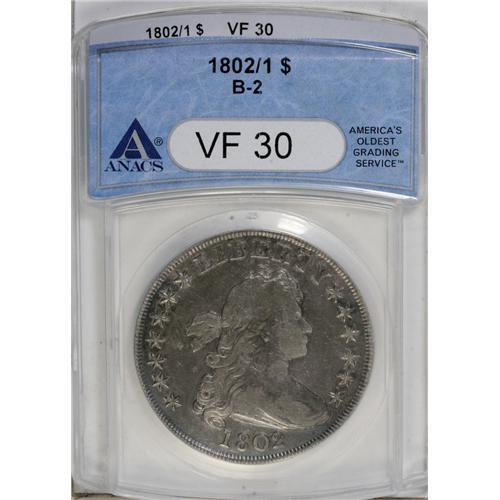 <B>1802/1 S$1 Wide Date VF30 ANACS.</B></I> B-2, BB-233, R.4. Overdates exist for several different denominations dated 1802, including the 1802/0 half cent, this silver dollar issue, and the 1802/1 half eagle. Among coins of these three denominations, eight physical obverse dies are known for the overdate coinage. There are five different overdated obverse dies for the silver dollars alone! The Mint obviously prepared several additional obverse dies in 1801, in anticipation of a coinage that never occurred. This piece has medium gray-brown color with lighter gray on the devices and darker steel in the fields. A few faint blemishes are noted but the overall appearance is nice.<BR><BR><b>Shipping:</b> Coin/Currency (<a target="_blank" href="http://www.heritageauctions.com/common/shipping.php">view shipping information</a>)