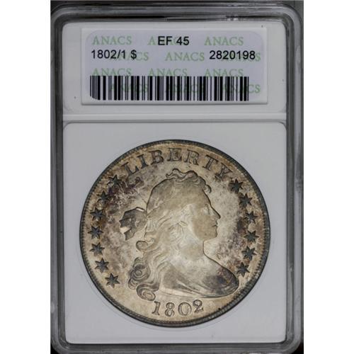 <B>1802/1<img border='0' src='http://www.heritagecoins.com/images/star.gif' width=10 height=10>$1> Wide Date XF45 ANACS.</B></I> B-2, BB-233, R.4. The underdigit 1 is obvious, and is centered within the 2 in the date. Remaining luster is pleasantly bountiful, and the only noticeable mark is a small dig on the lower right obverse field. This bright example displays blushes of light golden-brown and medium plum-russet toning. Bolender-2 is a better die pairing of the date; several times more difficult to locate than the usually encountered B-6. <BR><BR><B>Important notice:</B> Heritage usually auctions material at the rate of 200-250 lots per hour. On some occasions eBay Live bid software or the Internet may not be able to keep up with the pace of the auction. We recommend placing a realistic absentee bid now as insurance to avoid disappointment. Occasionally the auctioneer may eliminate or reject an eBay Live bid, and the auctioneer may also reopen a lot after the close of the eBay live bidding (usually because we missed an audience bid), and may reject your bid even if it shows you as the winning bidder. By bidding via eBay Live, you agree that Heritage may award the lot to another bidder at its sole discretion under the circumstances described above or any other reasonable circumstances. Since eBay bids are not shown to us until we open the lot on the floor, we treat those bids just like floor bids. In most cases the floor responds before the eBay bid is presented to us, due to Internet lag time, so for consistency we have made it a policy that floor bids are always considered first over tie eBay live bids. Also please note that all Heritage lots purchased through eBay Live carry a 20% Buyer's Premium. Please make sure you read the Terms and Conditions before you bid. This lot is being auctioned in conjunction with a live floor auction by Heritage Galleries & Auctioneers. All final auction and invoice information will be supplied by Heritage Galleries & Auctioneers, and all other information should be considered preliminary. Lot:2157 <BR><BR><B>Winning Notification and Billing:</B> After the FINAL session in this auction is complete, Heritage will send e-mail and snail mail invoices. This process normally takes several days. All final auction and invoice information will be supplied by Heritage Galleries & Auctioneers, and all other information should be considered preliminary. <BR><BR>This auction will be conducted on a live auction floor and over the Internet through eBay Live. If you choose to place an absentee bid, please take a moment to <font color='#0000ff'><u><a href='http://pages.ebay.com/liveauctions/help/before/laabsentee.html'>learn how eBay Live absentee bidding works</a></u></font><font color='#000000'>