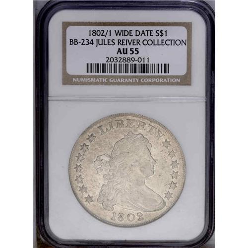 <B>1802/1<S$1> Wide Overdate. B-3, BB-234, R.3. AU55 NGC.</B></I> Wide overdate, 80 wider than 18 or 02; Outer arrow point below left upright of N. Reiver die state a. Bowers-Borckardt die state III. <B>This is the Reiver plate coin for the obverse and reverse of this variety.</B></I> A satiny coin that boasts ample luster and a decent strike on the central devices, but some of the stars lack their radial points on the right side. The surfaces are clean and attractive for the grade, with scattered handling ticks and hairlines expected for the grade. A blush of light gold toning on the obverse, more pronounced on the reverse with areas of speckled gray-gold. One of the more plentiful die pairings of the year, and always in good demand for the bold overdate feature.<BR> When the present coin was last sold in December, 1974, Stack's catalogued this as "A strong Very Fine, deep iridescent toning.". Yes times have changed, but these classic early silver dollars remain one of the most popular series in American numismatics. A lovely coin which is probably close to or just within the Condition Census for the variety.<BR><I>Ex: Stack's W. Earl Spies Collection (December, 1974), lot 223.</B></I> Envelope Included.