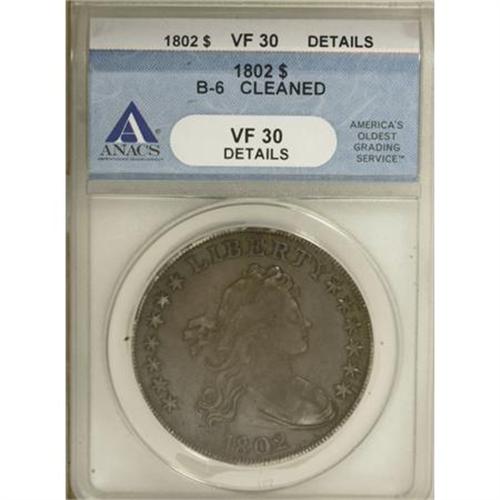 <B>1802 $1 Narrow Date--Cleaned--ANACS. VF30 Details.</B></I> B-6, BB-241, R.1. Bowers-Borckardt Die State III. Deep forest-green and lavender toning blend throughout this attractively detailed Narrow Date dollar. Luster emerges from protected areas of the design. A couple of minor obverse marks barely merit mention.<BR><I>From The John Stimson, Sr. Collection, Part Two.</B></I><BR><BR><B>Coin Engraver:</B> Robert Scot<BR><BR><b>Shipping:</b> Coins & Currency (<a target="_blank" href="http://www.heritageauctions.com/common/shipping.php">view shipping information</a>)