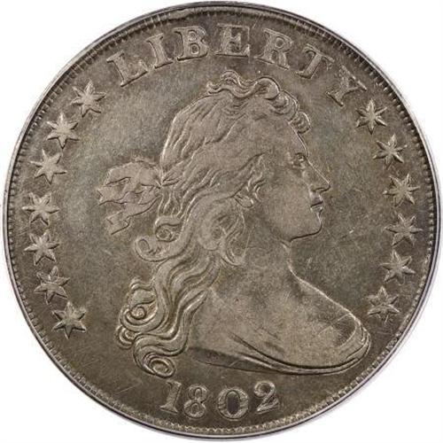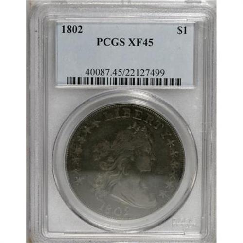 <B>1802 S$1 Narrow Date XF45 PCGS.</B></I> B-6, BB-241, R.1. Well struck for the grade with mottled gray-violet and olive toning. A few small marks are noted near Liberty's profile, and minor mint-made adjustments marks are observed near the obverse borders. Both sides display light, even wear, and the reverse is void of any detractions.<BR><BR><B>Coin Engraver:</B> Robert Scot<BR><BR><b>Shipping:</b> Coins & Currency (<a target="_blank" href="http://www.heritageauctions.com/common/shipping.php">view shipping information</a>)