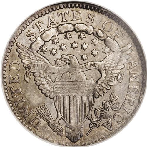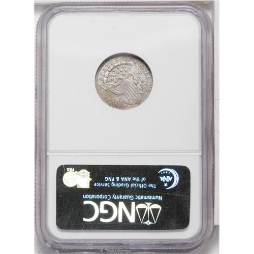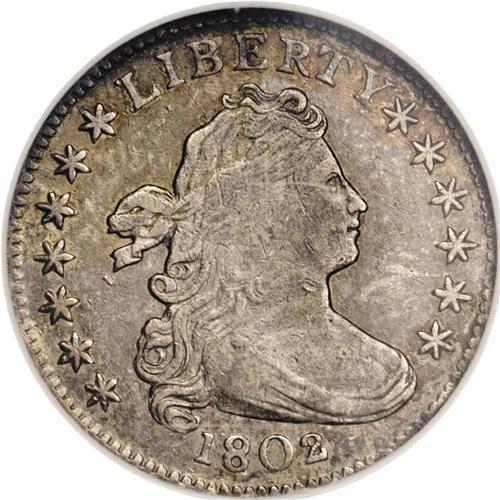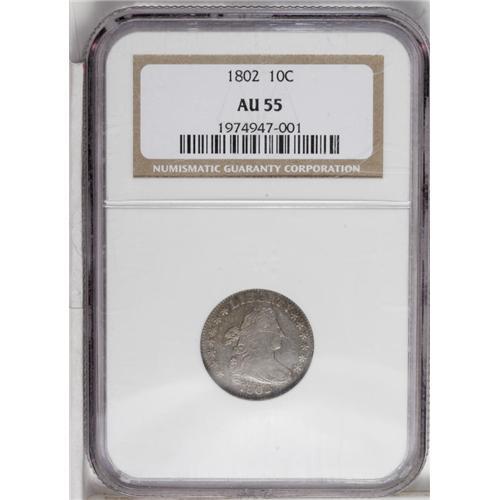 <B>1802<10C> AU55 NGC.</B></I> JR-4, R.4. Rich golden-brown and dove-gray patination drapes this high grade better date Draped Bust dime. Noticeable luster glows from legends and devices, and the striking weakness in the centers is characteristic for the type. Minor rim marks are present at 4 o'clock on each side. The low mintage of 10,985 pieces is divided between four very scarce to rare die marriages. JR-4 is recognized by the placement of star 8, further from the Y than on any other variety of the date. Another diagnostic is the lowest reverse star, which touches both tips of the eagle's beak. Census: 2 in 55, 2 finer (2/06).