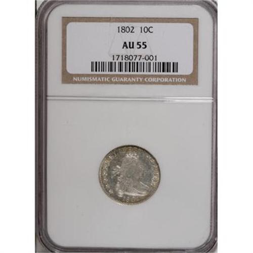 <B>1802 10C AU55 NGC.</B></I> JR-4, R.4. It seems remarkable that we are offering two Choice AU examples of the 1802 dime in this sale, especially since these coins represent two of the three pieces currently graded at AU55 by NGC. The primary die characteristic that identifies the JR-4 variety is that obverse star 8 is noticeably further away from the Y in LIBERTY than on any of the other three die marriages for this date. This piece shows well centered devices and considerable luster remnants for the grade. The silvery-gray surfaces are untoned, except for trace amounts of gold color near the margins. Modestly worn with a few scattered marks and pinscratches on each side. Census: 3 in 55, 4 finer (12/07). <BR><BR><B>Coin Engraver:</B> Robert Scot<BR><BR><b>Shipping:</b> Coins & Currency (<a target="_blank" href="http://www.heritageauctions.com/common/shipping.php">view shipping information</a>)