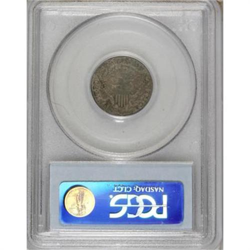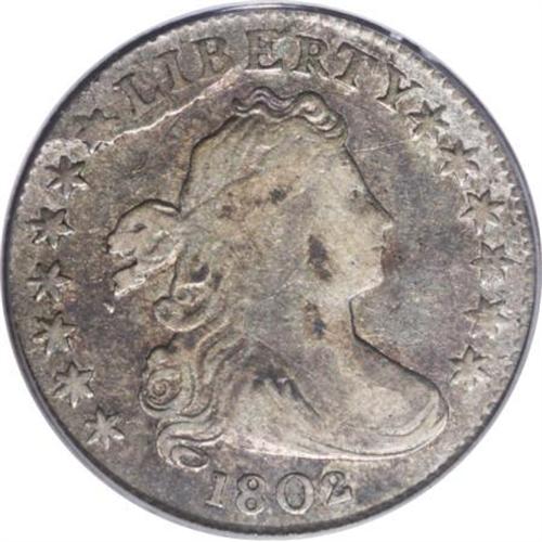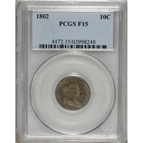 <B>1802 10C Fine 15 PCGS.</B></I> JR-4, R.4. A seldom-seen variety with a mintage of only 10,975 pieces. This is the most frequently seen variety of this scarce year. The obverse is struck from the terminal die state and shows the retained rim-to-rim break that describes an arc from star 7 through BE of LIBERTY. Only a dozen or so examples are believed known with this retained cud. All the coins show lettering within the arc of the die crack, and none are smooth in this area. Weakly struck in the right center of the reverse, as usual. The light gray surfaces are accented with speckled blue and golden-rose toning on each side. A few light marks and old, shallow scratches are consistent with the grade.<BR><BR><b>Shipping:</b> Coins & Currency (<a target="_blank" href="http://www.heritageauctions.com/common/shipping.php">view shipping information</a>)
