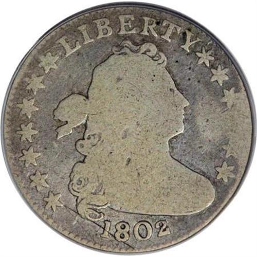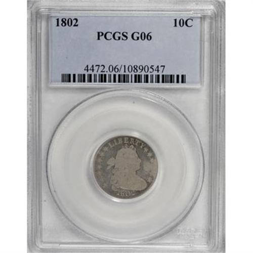 <B>1802 10C Good 6 PCGS.</B></I> JR-4, R.4. Cream-gray devices contrast slightly with lavender fields. All letters are distinct from the rim save for the CA in AMERICA. Obverse stars 10 to 12 are also partly faded, and a thin mark passes through the 18 in the date. A rare date, since PCGS and NGC combined have certified only 66 examples (8/07).<I><BR>From The Beau Clerc Collection.</B></I><BR><BR><B>Coin Engraver:</B> Robert Scot<BR><BR><b>Shipping:</b> Coins & Currency (<a target="_blank" href="http://www.heritageauctions.com/common/shipping.php">view shipping information</a>)