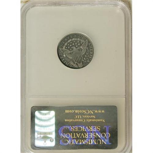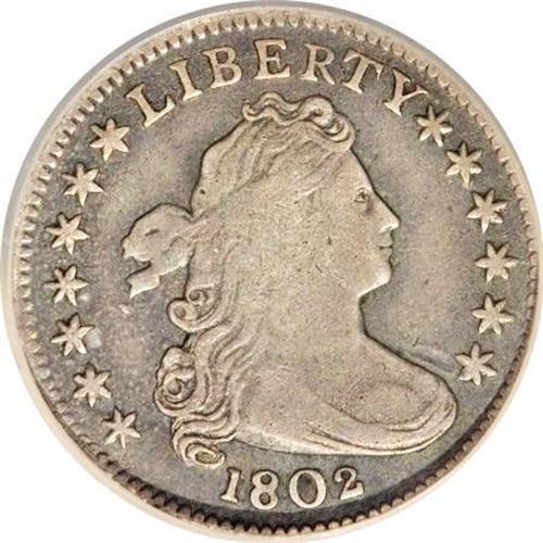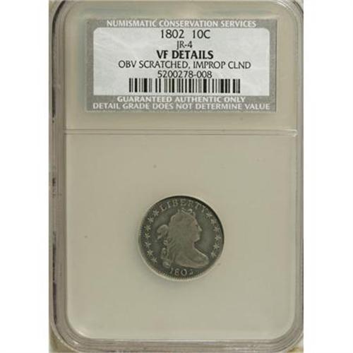 <B>1802 10C --Obverse Scratched, Improperly Cleaned--NCS. VF Details.</B></I> JR-4, R.4. A distinctive variety identified by an extended eagle's lower beak through two points of the lowest reverse star. The surfaces are smooth overall, but a relatively deep mark is present near obverse star 13, partly concealed by the deep cream-gray toning seen on both sides. Minutely granular from a relatively mild cleaning.<BR><BR><B>Coin Engraver:</B> Robert Scot<BR><BR><b>Shipping:</b> Coins & Currency (<a target="_blank" href="http://www.heritageauctions.com/common/shipping.php">view shipping information</a>)