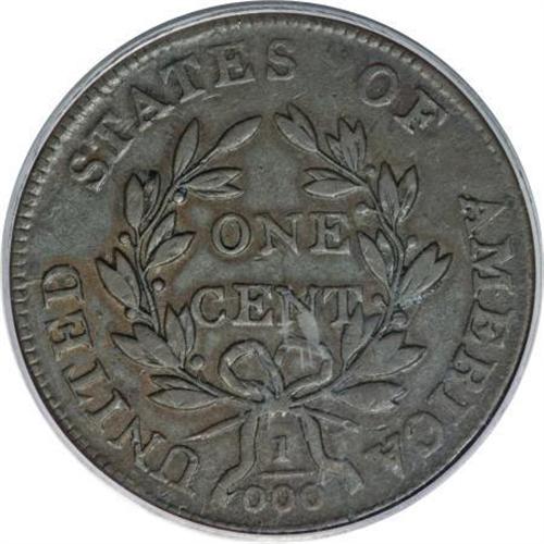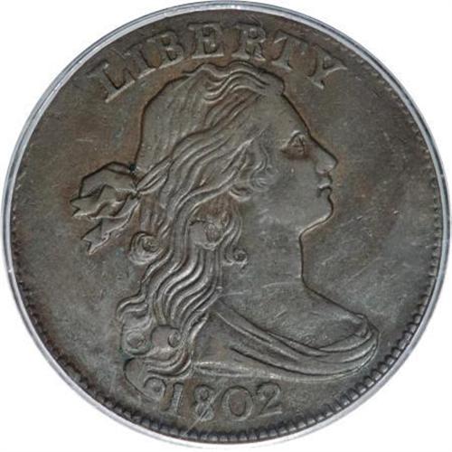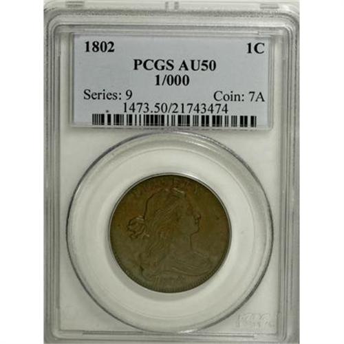 <B>1802 1C 1/000 AU50 PCGS.</B></I> S-228, R.2. The only blundered fraction variety among 1802 die pairings and a popular issue as such. The surfaces are a deep chestnut-brown color with an attractive glossy finish, accompanied by an essentially mark-free appearance. This unusually high grade example appears to have originated from an early state of the dies as there are no singularly mentionable flaws or cracks. About 15 degrees of clockwise die rotation is also noted. While researching the current population data on the S-228 variety, this is the single AU50 thus far certified by PCGS, and just three pieces are graded finer (11/07). Certainly a Condition Census example of this interesting variation. EAC 30.<BR><BR><B>Coin Engraver:</B> Robert Scot<BR><BR><b>Shipping:</b> Coins & Currency (<a target="_blank" href="http://www.heritageauctions.com/common/shipping.php">view shipping information</a>)