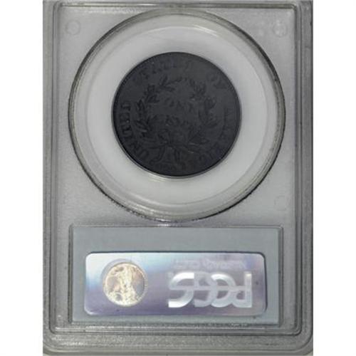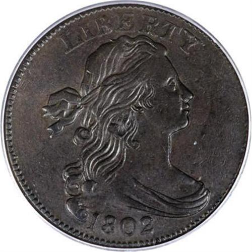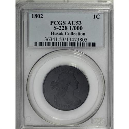 <B>1802 1C 1/000. AU53 PCGS. Double-Struck S-228, B-4, R.2.</B></I> <B>Bland XF45; tied for CC-10. Noyes XF45; CC-7. Photo #34694. Our EAC Grade XF45.<BR><BR>Equivalents. </B></I>Proskey 1; Doughty 164; McGirk 1A; Ross 1-A; Newcomb 6; EAC 4; <I>Encyclopedia </B></I>1745; PCGS #1473.<BR><B><BR>Variety. </B></I>Base of R nearly sits on hair. 1/000. The obverse appears on S-227 and S-228. The reverse appears on 1801 S-223 and 1802 S-228.<BR><B><BR>Surfaces. </B></I>The reverse of this piece is noticeably double-struck. Pleasing deep olive surfaces with traces of luster still visible. Both sides are lightly abraded, and intermingled with original planchet marks.<BR><B><BR>Die State II. </B></I>An early die state with a short reverse crack from the border to D. Because the reverse is double-struck, a second impression of this die crack can be seen at the border about four dentils right of the primary crack. The obverse die progression demonstrates that S-228 was struck before S-227.<BR><B><BR>Census. </B></I>Several higher grade pieces are known, including five Mint State coins and four AU's that are included in Bland's list.<BR><BR><B>Commentary. </B></I>An important <I>Guide Book</B></I> variety with the error fraction, and even more important for the sharply doubled reverse.<BR><BR><B>Provenance. </B></I><I>Jody Hawkins; Robert L. Hughes (6/1980), lot 25; Douglas Bird (9/1988); Gary Ruttenberg (10/1990); Robinson S. Brown, Jr. (Superior, 1/1996), lot 321, $3,080; Chris Kromer; Superior (2/2001), lot 2252, $2,990.</B></I><BR><BR><B>Personality. </B></I>A noted coin dealer and trader, <B>Robert L. Hughes</B></I> is primarily a wholesale dealer, as he has been for most of his career, though Q. David Bowers notes in <I>The American Numismatic Association Centennial History</B></I> that in his time, "without doubt he was one of the prime factors in the commercial end of the hobby." The pieces he has handled include a number of Condition Census half cents and large cents.<BR><BR><b>Shipping:</b> Coins & Currency (<a target="_blank" href="http://www.heritageauctions.com/common/shipping.php">view shipping information</a>)