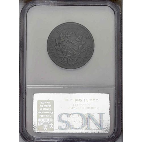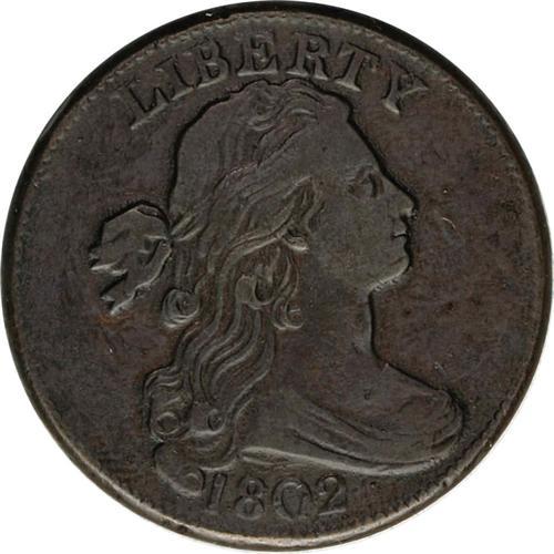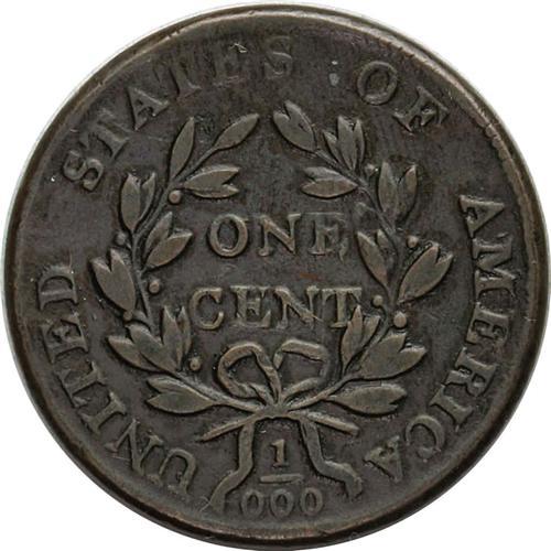 <B>1802<1C> 1/000. S-228, B-4, R-2--Improperly Cleaned--NCS. VF Details. Fine 15 EAC.</B></I> The reverse is rotated a few degrees clockwise. This is an important example with a die crack from the right pendant of T in STATES, continuing to the terminal leaves in the wreath. Grayish-brown color with some steel-brown verdigris.<BR><I>Ex: Edward Schwartz; George Ramont.</B></I> Envelope Included.
