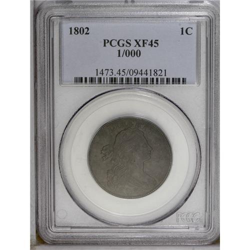 <B>1802<1C> 1/000 XF45 PCGS.</B></I> S-228, R.2. An early die state of this popular mispunched denomination. The surfaces have even brown patina with just a bit of luster still clinging to the devices. Sharply struck on the obverse, but soft on the reverse wreath. EAC 25. <BR><BR><B>Important notice:</B> Heritage usually auctions material at the rate of 200-250 lots per hour. On some occasions eBay Live bid software or the Internet may not be able to keep up with the pace of the auction. We recommend placing a realistic absentee bid now as insurance to avoid disappointment. Occasionally the auctioneer may eliminate or reject an eBay Live bid, and the auctioneer may also reopen a lot after the close of the eBay live bidding (usually because we missed an audience bid), and may reject your bid even if it shows you as the winning bidder. By bidding via eBay Live, you agree that Heritage may award the lot to another bidder at its sole discretion under the circumstances described above or any other reasonable circumstances. Since eBay bids are not shown to us until we open the lot on the floor, we treat those bids just like floor bids. In most cases the floor responds before the eBay bid is presented to us, due to Internet lag time, so for consistency we have made it a policy that floor bids are always considered first over tie eBay live bids. Also please note that all Heritage lots purchased through eBay Live carry a 20% Buyer's Premium. Please make sure you read the Terms and Conditions before you bid. This lot is being auctioned in conjunction with a live floor auction by Heritage Galleries & Auctioneers. All final auction and invoice information will be supplied by Heritage Galleries & Auctioneers, and all other information should be considered preliminary. Lot:247 <BR><BR><B>Winning Notification and Billing:</B> After the FINAL session in this auction is complete, Heritage will send e-mail and snail mail invoices. This process normally takes several days. All final auction and invoice information will be supplied by Heritage Galleries & Auctioneers, and all other information should be considered preliminary. <BR><BR>This auction will be conducted on a live auction floor and over the Internet through eBay Live. If you choose to place an absentee bid, please take a moment to <font color='#0000ff'><u><a href='http://pages.ebay.com/liveauctions/help/before/laabsentee.html'>learn how eBay Live absentee bidding works</a></u></font><font color='#000000'>