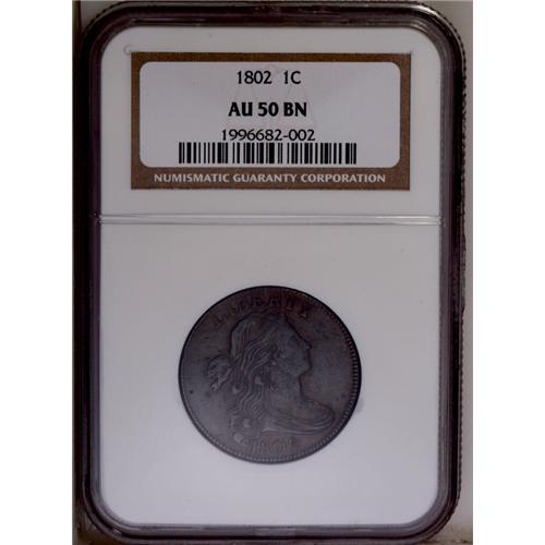 <B>1802<1C> AU50 NGC.</B></I> S-232, B-12, R.1. This steel-gray and golden-brown representative has attractive detail on Liberty's hair. A small rim nick at 9:30 and distributed light obverse marks do not deny the eye appeal. EAC 35.