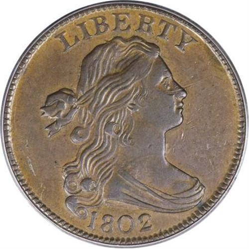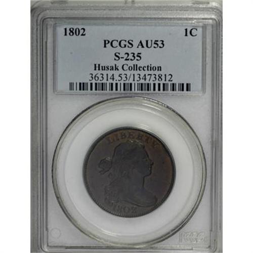 <B>1802 1C AU53 PCGS. S-235, B-15, R.3.</B></I> <B>Bland XF45; tied for CC-7. Noyes XF40; tied for CC-6. Photo #28581. Our EAC Grade XF40.<BR><BR>Equivalents. </B></I>Proskey 15; Doughty 178; McGirk 8A; Ross 11-K; Newcomb 13; EAC 13; <I>Encyclopedia </B></I>1749; PCGS #1470.<BR><B><BR>Variety. </B></I>Curl point below center of B. Leaf point below upright of D, nine berries. The obverse appears on S-235. The reverse appears on S-234, S-235, and S-236.<BR><B><BR>Surfaces.</B></I> Chestnut, olive, and steel are blended on both surfaces of this pleasing cent. The obverse has a small scrape across the nose into the right field, and another just inside the border at 8 o'clock. A few small abrasions accompany a blunt strike on the reverse.<BR><BR><B>Die State II. </B></I>A rare early die state with clash marks left and right of the head, but no failure through RTY.<BR><BR><B>Census. </B></I>Finest known is a lovely MS65 coin that is illustrated in several cent references. That coin is followed by one other Mint State coin, and four AU pieces One of the finer pieces is in the ANS, so this Husak specimen could be labeled "Collectible Condition Census."<BR><BR><B>Provenance. </B></I><I>Wayte Raymond (1926); George H. Clapp; Howard R. Newcomb (J.C. Morgenthau, 2/1945), lot 368, $37.50; Judge Thomas Gaskill; New Netherlands (1956); Dorothy Paschal (1972); Robinson S. Brown, Jr. (Superior, 9/1986), lot 348, $1,045; Herman Halpern (Stack's, 3/1987), lot 150 $990; Robert Matthews (Superior, 5/1989), lot 420, $1,155; Robinson S. Brown, Jr. (Superior, 1/1996), lot 329, $2,200; Wes Rasmussen (Heritage, 1/2005), lot 3283, $5,463.</B></I><BR><BR><B>Personality. </B></I>A third-generation pharmacist, <B>Robert Matthews</B></I> (1929-2000) caught the coin bug from his father and opened a coin shop in 1962. Many of his large cents were purchased from Jackson Storm, with others acquired at auction and privately. Superior sold his collection in May 1989. Today, his son Tom carries on the family collecting tradition.<BR><BR><b>Shipping:</b> Coins & Currency (<a target="_blank" href="http://www.heritageauctions.com/common/shipping.php">view shipping information</a>)