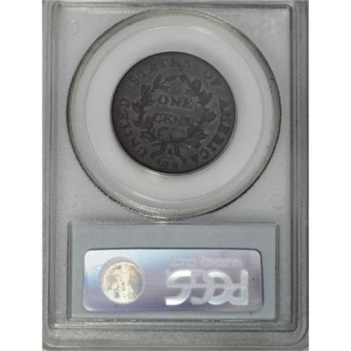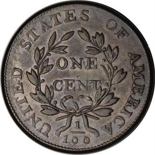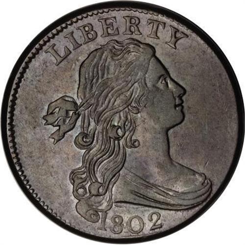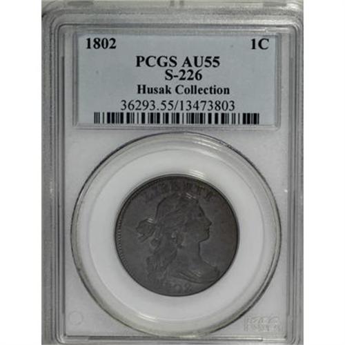 <B>1802 1C AU55 PCGS. S-226, B-2, R.3. </B></I> <B>Photo #60003. Our EAC Grade XF45.<BR><BR>Equivalents. </B></I>Proskey 10; Doughty 173; McGirk 12A; Ross 7-J; Newcomb 2; EAC 2; <I>Encyclopedia </B></I>1750; PCGS #1470.<BR><B><BR>Variety. </B></I>1 joins hair and nearly joins curl. Incomplete ribbon bows. The obverse appears on S-225 and S-226. The reverse appears on S-226, S-227, S-229, and NC-1.<BR><B><BR>Surfaces. </B></I>Attractive olive and tan with hints of faded mint red on the reverse. A few minor abrasions and hairlines do nothing to disturb the eye appeal. The lower right obverse has a short diagonal mark near the upper drapery fold and shallow dents are located in the field close to the back of the head, below the right side of L.<BR><B><BR>Die State III. </B></I>The reverse has a light crack through the tops of AMERI.<BR><B><BR>Census. </B></I>Much like S-225, several Mint State and AU examples of S-226 are available to collectors. Apparently unknown to Bland or Noyes when they published their Condition Census notes. Our EAC grade would place this specimen in a tie for 11th place in the Bland Census, or alone in eighth place in the Noyes Census.<BR><B><BR>Commentary. </B></I>Two XF coins that Noyes records in his Census are called "untraced" and either of those could be the same as this coin. The Husak coin is not the example that was last seen in 1975 EAC sale, but might be the French-T. James Clarke coin, that has been untraced since B. Max Mehl handled it in the 1940s.<BR><BR><B>Provenance. </B></I><I>Doug Bird (2006).</B></I><BR><BR><b>Shipping:</b> Coins & Currency (<a target="_blank" href="http://www.heritageauctions.com/common/shipping.php">view shipping information</a>)
