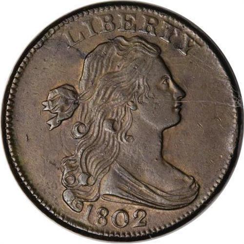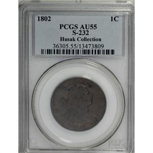 <B>1802 1C AU55 PCGS. S-232, B-12, R.1. </B></I> <B>Photo #28089. Our EAC Grade XF40.<BR><BR>Equivalents. </B></I>Proskey 5; Doughty 168; McGirk 10A; Ross 4-E; Newcomb 10; EAC 10; <I>Encyclopedia </B></I>1747; PCGS #1470.<BR><B><BR>Variety. </B></I>T corrected from Y. Long fraction bar. The obverse appears on S-232 and S-233. The reverse appears on S-232.<BR><B><BR>Surfaces.</B></I> Attractive reddish-brown surfaces with olive overtones. Some faded red is evident on the reverse. The sharpness is about 10 points finer than our EAC grade, downgraded due to a small dark spot at the left base of Y, another behind the head, and minor obverse rim bumps at 3 o'clock and 10:30. A few other minor blemishes are of little consequence.<BR><BR><B>Die State VI. </B></I>A late die state with a reverse rim break joining the top of the second T in STATES.<BR><BR><B>Census. </B></I>The finest known example of this die marriage is in the ANS Collection, followed by numerous other Mint State and AU coins. This is one of the few Husak coins that does not rank in the extended Condition Census of Noyes. <BR><BR><B>Commentary. </B></I>This is an excellent opportunity for the date or type collector to acquire a coin from the Husak Collection. The variety is common, the grade is below the extended Census, and the earlier provenance is unrecorded. The S-232 might prove to be one of the most affordable coins in this offering, an excellent example for the pedigree collector. In fact, the current cataloger might actually consider this coin for his own pedigree collection.<BR><BR><B>Provenance.</B></I> We have not determined the past provenance of this specimen.<BR><BR><b>Shipping:</b> Coins & Currency (<a target="_blank" href="http://www.heritageauctions.com/common/shipping.php">view shipping information</a>)