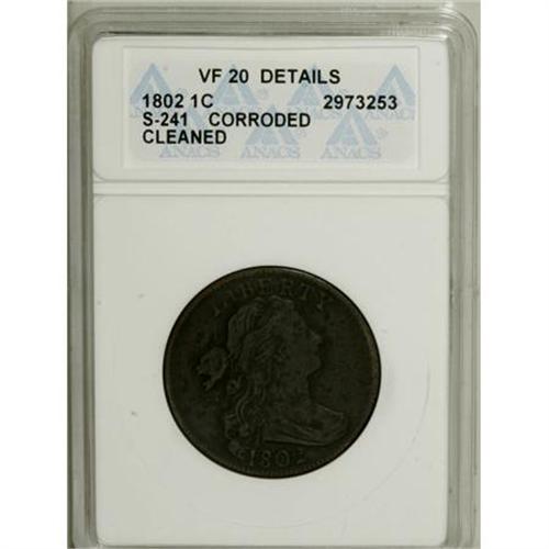 <B>1802 1C --Cleaned, Corroded--ANACS. VF20 Details.</B></I> S-241. NGC Census: (13/175). PCGS Population (28/200). Mintage: 3,435,100. Numismedia Wsl. Price for NGC/PCGS coin in VF20: $267. (#1470)<BR><BR><b>Shipping:</b> Coins & Currency (<a target="_blank" href="http://www.heritageauctions.com/common/shipping.php">view shipping information</a>)