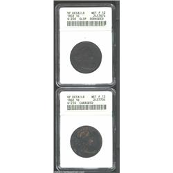 1802 1C--Clip, Corroded--ANACS, VF Details, Net Fine 12, S-230, this is a dark, rough textured example with a small (less than 5%) clip at 4 o'clock on the obverse; and an 1802--Corroded--ANACS, VF Details, Net Fine 12, S-230, the otherwise rough, charcoal colored surfaces reveal a few swirls of bright orange-red color on the obverse. 2 coins Important notice: We expect to be auctioning lots at the rate of 200-250 per hour. Sometimes eBay Premier live bid software cannot keep up with that pace, so we strongly recommend that you place a realistic proxy bid now as insurance to avoid disappointment. Also please note that all Heritage/CAA lots purchased through eBay Premier carry a 20% Buyer's Premium. Please make sure you read the Terms and Conditions.