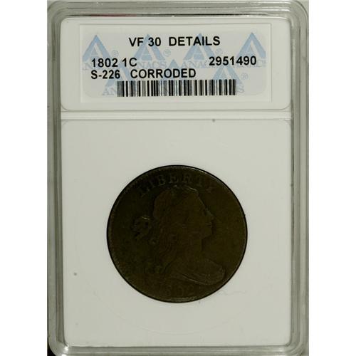 <B>1802 1C --Corroded--ANACS. VF30 Details.</B></I> S-226, B-2, R.3. NGC Census: (61/188). PCGS Population (24/149). Mintage: 3,435,100. Numismedia Wsl. Price: $440. (#1470)<BR><BR><b>Shipping:</b> Coins & Currency (<a target="_blank" href="http://www.heritageauctions.com/common/shipping.php">view shipping information</a>)
